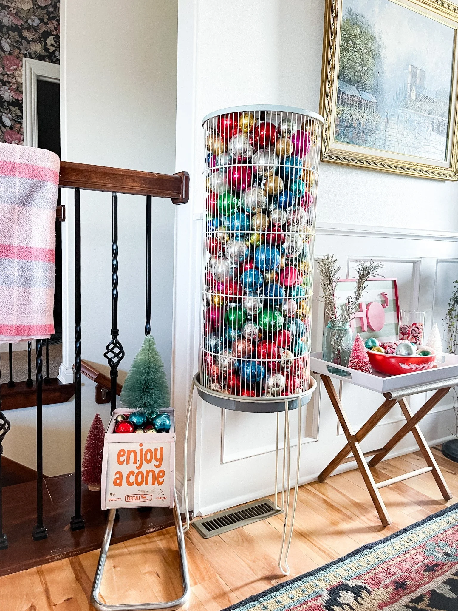 @k.grayinteriors has a beautiful Chinoiserie style display in her entryway with vintage Shiny Brites mixed in! I love the two different styles together and her color palette is so good! I love that she layered so many pieces together to create a large focal point in the space. The fishbowl planter used as a base for the tree is perfect and it looks extra special on the silver tray.